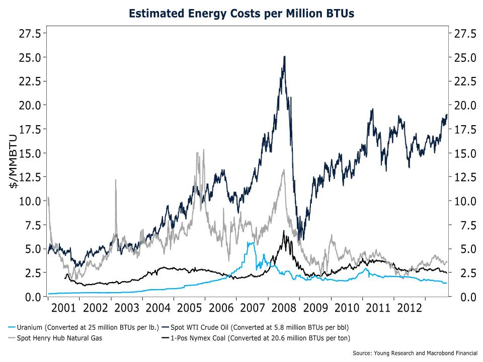 The “Estimated Energy Costs per Million BTUs” chart from Young Research & Publishing gives you a quick comparison of oil, natural gas, coal, and uranium. As you can see, natural gas offers good value compared to oil. Over time good ideas will find their way in the marketplace at the right price and tend to evolve over time rather than an overnight revolution. Cheap natural gas will find a home. Kinder Morgan is expanding its pipelines into Mexico. Don’t speculate on short-term natural gas prices but do understand the unique long-term value it offers today to companies that move it.