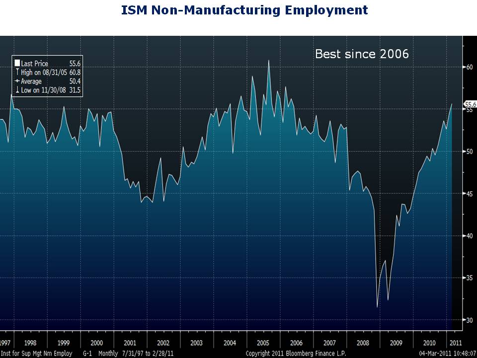 Lots of new data on labor market came out this week. I want to run through a few charts on the more important data points. First is the February ISM manufacturing index. The employment component of the manufacturing index surged to its highest level in almost four decades. The last time hiring intentions in the manufacturing sector were this strong was in 1973. The employment component of the non-manufacturing sector was also strong. My chart shows that non-manufacturing employment intentions reached their highest level since 2006.