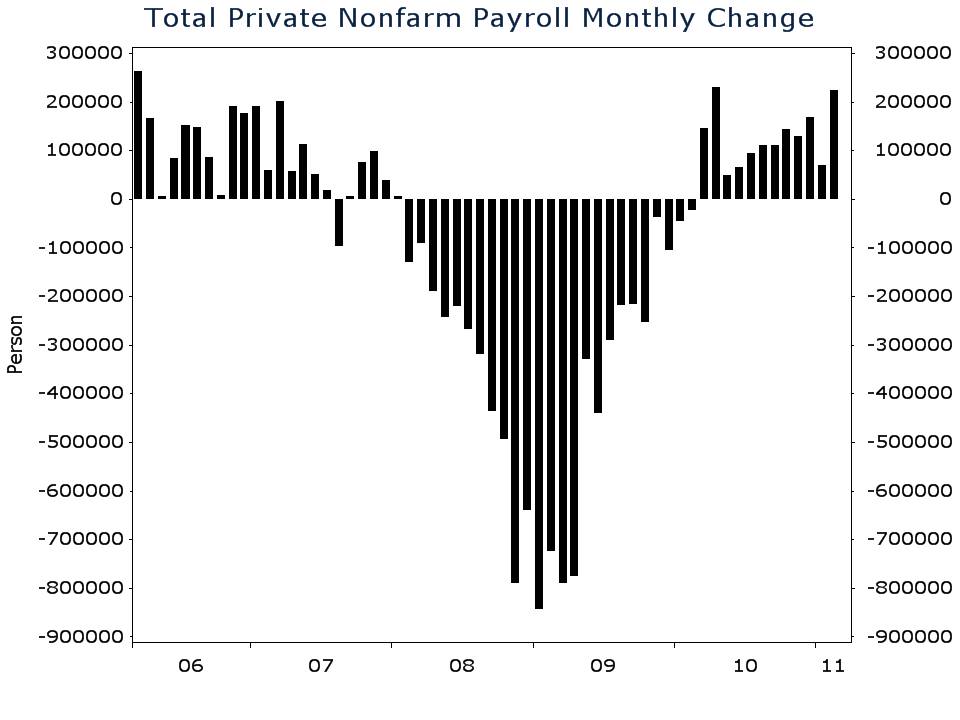 This weekโs most important employment data was released on Friday in the February jobs report. The headline numbers that economists and investors tend to focus on are the change in nonfarm payrolls and the unemployment rate. The consensus estimate for the change in nonfarm payrolls was an increase of 196,000. The actual change in nonfarm payrolls was an increase of 192,000, which missed estimates, but private-sector employment increased by 222,000โexceeding estimates by 22,000. The monthly increase in private payrolls (see chart) was the best since April of last year.