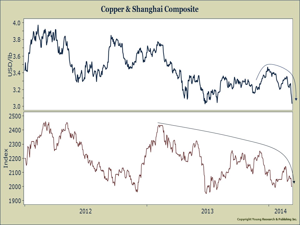According to official statistics, China’s economy has grown at an average rate of about 7.5% in recent years. But PhD Copper says something has gone awry with the Middle Kingdom’s command style economic model. China is the world’s largest consumer of copper. If Copper prices are plummeting, the odds are China has something to do with it. The red flag that copper prices are sending on the Chinese economy is also being confirmed by the weakness in the Shanghai Composite Index. The performance of Chinese stock prices don’t seem to correlate with robust economic growth.