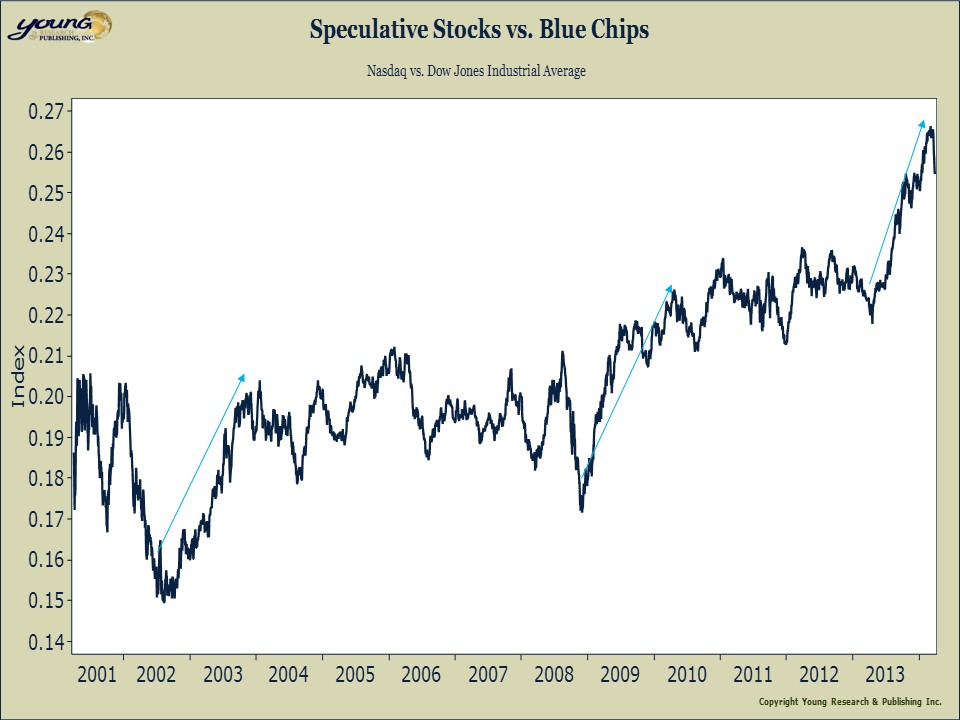 The speculative conditions in the market are best captured by the ratio of the NASDAQ to the blue-chip Dow Jones Industrial Average. When NASDAQ stocks are beating the blue-chips by such a large margin, you can be sure there is speculative froth in the market. Today, we are looking at one of the most speculative markets in over a decade.
