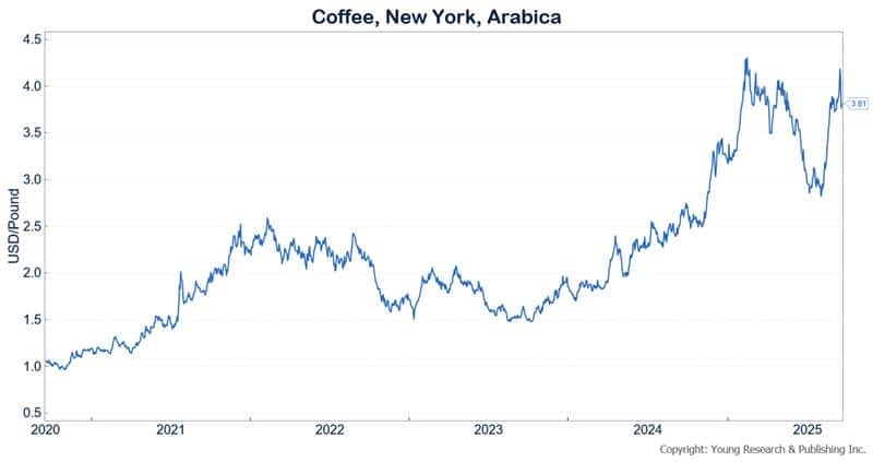 Arabica coffee futures surged to $4.24/lb on Tuesday, nearing an all-time high, driven by US tariffs on Brazilian imports and dry weather in Brazil threatening crop yields, according to Reuters. Prices later fell slightly as investors took profits, closing at $4.0935/lb. Brazil, which supplies 30% of US coffee, was hit with a 50% tariff on all goods, including green coffee, by the Trump administration in July, disrupting the supply chain and sending prices higher. With imports drying up, US roasters are scrambling for inventory, while American coffee farmers see a rare business opportunity. Speculators are fueling the rally as producers unwind hedges to avoid high margin costs. They write: