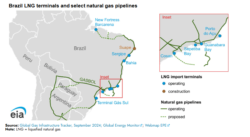 In 2024, three new terminals added an estimated 1.74 Bcf/d of capacity:ย New Fortress Energy’s Barcarenaย Floating Storage and Regasification Unit (FSRU) with a capacity of 0.75 Bcf/d,ย Terminal Gรกs Sul FSRUย (0.50 Bcf/d), andย Compass Gรกs & Energia’s Cosan terminalย (0.50 Bcf/d). Terminals installed prior to 2024 includeย Sepetiba Bay FSRUย (0.36 Bcf/d),ย Porto do Aรงu FSRUย (0.74 Bcf/d),ย Sergipe FSRUย (0.74 Bcf/d),ย Bahia FSRUย (0.71 Bcf/d), andย Guanabara Bay FSRUย (0.80 Bcf/d).