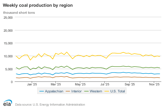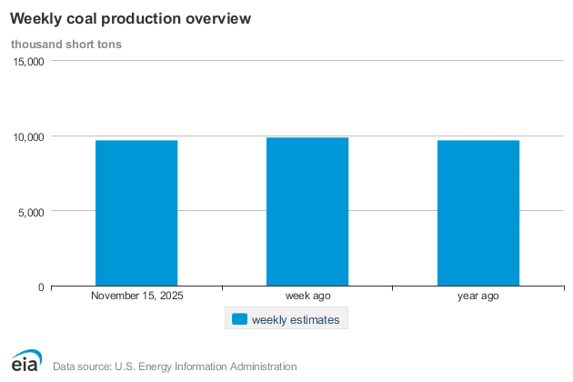 The US Energy Information Administration reports that US coal production for the week is estimated at 9.7 million short tons (MMst), down 1.9% from last week and 0.1% below the same week in 2024. Production east of the Mississippi totaled 4.1 MMst, while the west produced 5.6 MMst. Year-to-date, US coal production stands at 467.2 MMst, up 3.8% compared with the same period last year. The EIA writes: