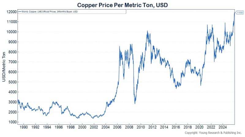 Copper surged to a new all-time high above $12,000 a ton, driven by severe mine outages and trade disruptions, putting the metal on track for its strongest annual gain since 2009. Prices have climbed more than 30% this year as fears of US tariffs sparked a rush of imports, tightening global supply despite weakening demand in China, reports Mark Burton of Bloomberg. Supply disruptions across major mining regions and expectations of a deepening market deficit are reinforcing bullish forecasts, with banks warning that copper could face its most severe shortfall in decades and that prices could rise even further. Burton writes: