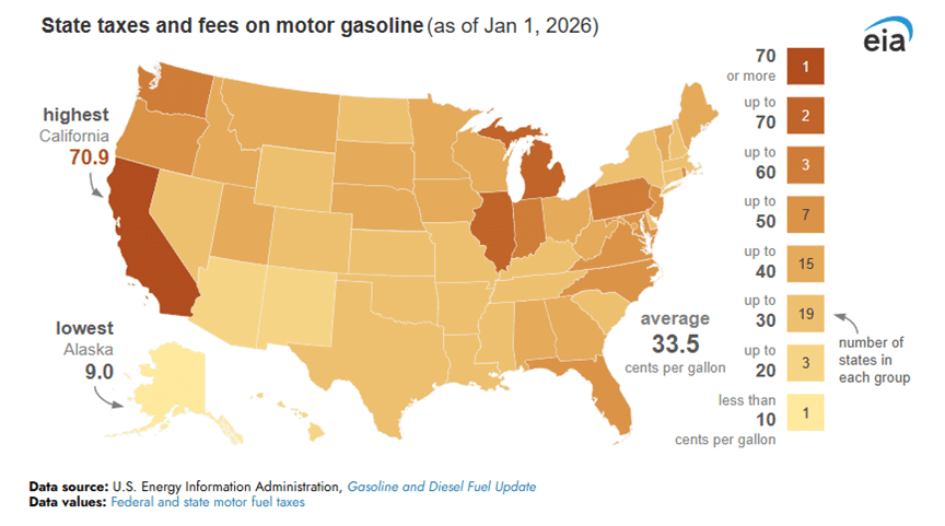 State taxes and fees on motor gasoline as of January 1, 2026, ranged from a high of 70.9 cents per gallon (c/gal) in California to a low of 9.0 c/gal in Alaska. State gasoline taxes averaged 33.5 c/gal across states, a slight increase from their average last year.