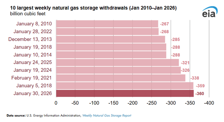 Working natural gas stocks fell 360 billion cubic feet (Bcf) in the Lower 48 states for the week ending January 30, 2026, amid Winter Storm Fern—the largest weekly net withdrawal reported in the history of the Weekly Natural Gas Storage Report. The withdrawal exceeded the five-year average for the same week by 89% (170 Bcf). The large withdrawals resulted from increased heating demand for natural gas and natural gas production curtailments because of severe winter weather. Working gas stocks are now 1.1% below the five-year average for this time of year.