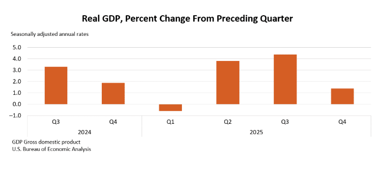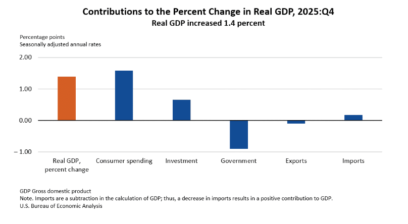 The US Bureau of Economic Analysis (BEA) reported that real GDP grew at an annualized rate of 1.4% in the fourth quarter of 2025, slowing sharply from 4.4% in the third quarter. Growth was driven by consumer spending and investment, but declines in government spending and exports weighed on the overall pace. Imports fell, which partially supported GDP.