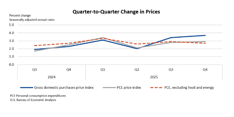 For full-year 2025, the economy expanded 2.2%, down from 2.8% in 2024, with consumer spending and investment leading gains. Inflation measures ticked slightly higher in the fourth quarter, with the PCE price index rising 2.9%, while core PCE (excluding food and energy) increased 2.7%. The BEA writes:
