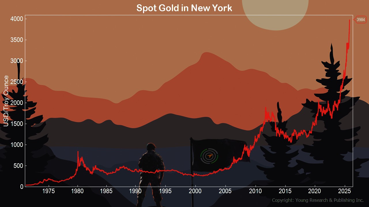 While gold futures have crossed the important $4,000 per ounce mark, spot gold, the price someone will pay today, hasn’t quite gotten there. The spot price of gold closed last night in New York at $3,984/troy ounce. In other words, a dollar’s value has fallen from around 1/35th of an ounce of gold during Bretton Woods, to 1/3,984th of an ounce of gold today.