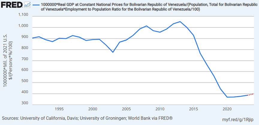 As we see in our FRED graph above, Venezuela’s real output per worker has plummeted since 2013. The average Venezuelan worker used to generate $1,014 of goods and services in 2008. In 2025 that worker generated only $391 of goods and services. Despite the mass exodus of Venezuelans who left the country starting in 2016, real output also sharply contracted, as discussed in an older post.