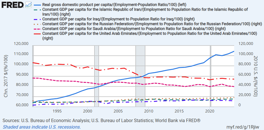 Our second FRED graph (above) shows the same output-per-worker statistic for the US and 5 other major oil producers: Iran, Iraq, Russia, Saudi Arabia, and the United Arab Emirates.