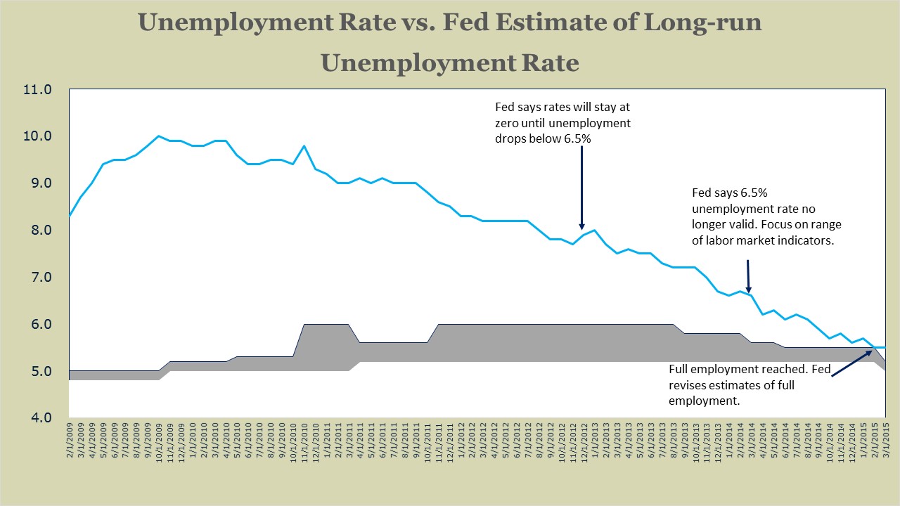 The Fed has once again moved the goal posts for when it will hike interest rates. In December of 2012, the Fed told us that it would hike rates when unemployment fell below 6.5%. But when the unemployment rate hit 6.6% last March, Yellen dropped the 6.5% threshold and told investors to focus on a range of labor market indicators. Now with the U.S. economy at full employment, the Fed has found another reason to continue running emergency monetary policy.ย How are they doing it? The same way any good central bank setting policy by the seat of its pants would, by redefining full employment. As you can see in my chart below, as the unemployment rate has come down the Fedโs forecasts for full employment have also moved down, allowing the bank to maintain easy money. Problem solved. Unless of course you are one of the millions of American savers or retired investors suffering from the seven year famine in interest income.