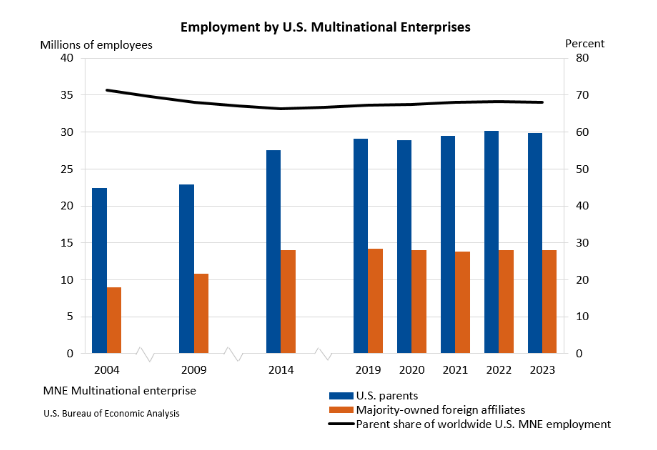 Employment in the United States by U.S. parentsย decreased 0.8 percent to 29.9 million workers in 2023. U.S. parents accounted for 68.1 percent of worldwide employment by U.S. multinational enterprises (MNEs), down from 68.3 percent in 2022. Employment abroad by foreign affiliates of U.S. MNEs increased 0.2 percent to 14.0 million workers and accounted for 31.9 percent of employment by U.S. MNEs worldwide.