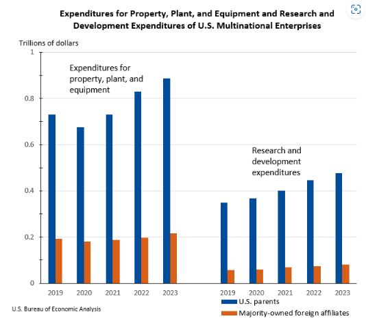 In 2023, worldwide employment by US multinational enterprises (MNEs) declined by 0.4% to 43.9 million workers, according to the US Bureau of Economic Analysis. Employment within the US by parent companies fell 0.8% to 29.9 million, while jobs at foreign affiliates rose slightly to 14 million. US MNEs’ global value added decreased 0.6% to $6.9 trillion, with US parents contributing $5.3 trillion. However, spending on property, plant, and equipment rose 7.5% to $1.1 trillion, and R&D spending also increased 7.5% to $558.3 billion. The largest foreign employment was in India, Mexico, and the UK, while value added abroad was highest in the UK, Canada, and Ireland. They write: