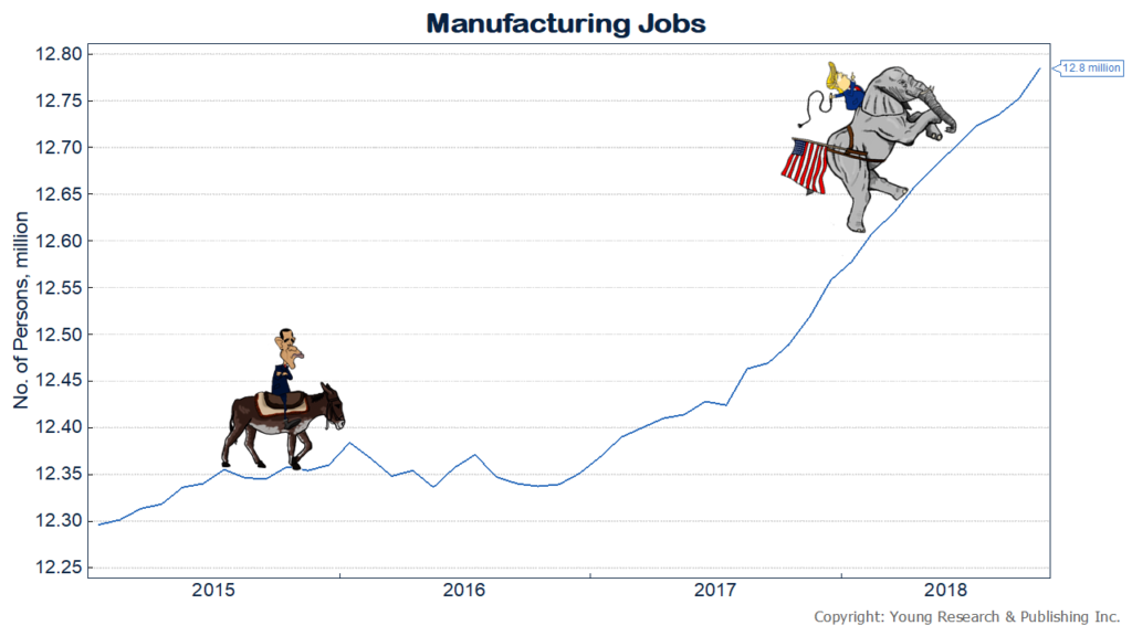 Let’s look at the numbers. Since Trump gained office, 4.4 million new jobs have been created. A big slice of that came from manufacturing. We were assured by any number of experts in recent years that manufacturing was “dead.” But in October some 32,000 new manufacturing jobs were created, for a total of 446,000 since Trump took office.