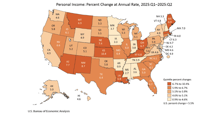 Personal income increased in all 50 states and the District of Columbia in the second quarter of 2025. Theย percent change at an annual rate in current-dollar personal incomeย was 5.5 percent nationally, with state-level changes ranging from a 10.4 percent increase in Kansas to a 0.9 percent increase in Arkansas. In the District of Columbia, personal income increased by 4.9 percent.