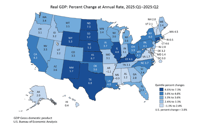 Real GDP increased in 48 states in the second quarter of 2025. Theย percent change at an annual rate in real GDP was 3.8 percent nationally, with state-level changes ranging from a 7.3 percent increase in North Dakota to a 1.1 percent decline in Arkansas. In the District of Columbia, real GDP growth was unchanged.