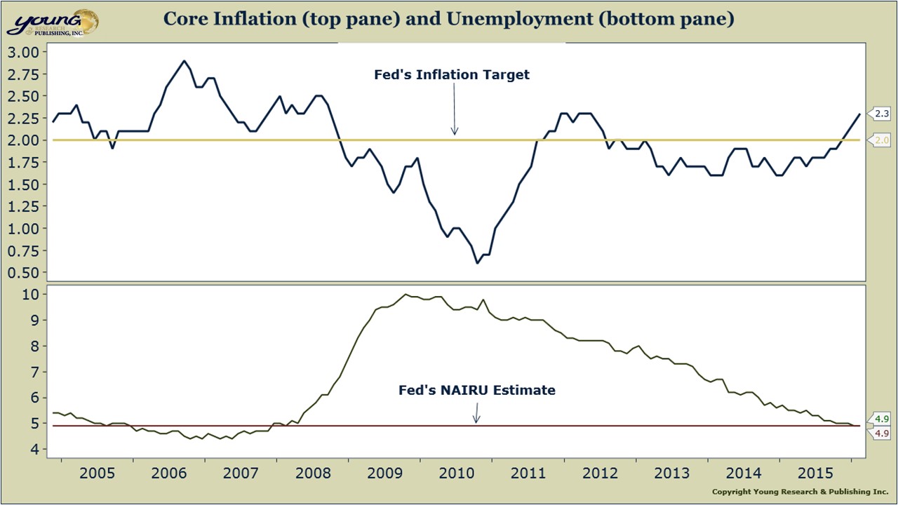 As the chart below makes clear, the Fed is meeting is now meeting its congressionally mandated objectives. The same objectives Yellen & Co., has thrown in the face of the public at every Fed meeting to justify a continued ultra-loose monetary policy when none was needed. Now that the mandate has been met, look for the Fed to dream up new and even less credible ways to keep the monetary spigot wide open.