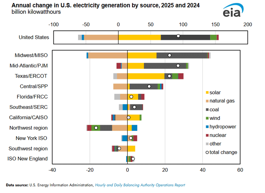 • In Texas, where demand increased 5% (22 BkWh) in 2025 compared with 2024, solar generation increased by 20 BkWh, while natural gas generation decreased by 6 BkWh.