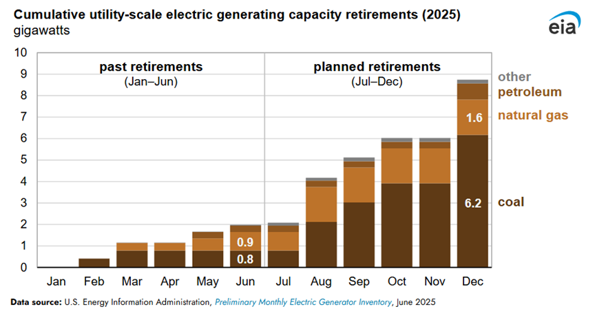 Developers retired relatively little generating capacity in the first half of 2025. Of the 8.7 GW of electric generating capacity that U.S. operators plan to retire during 2025, only 2.0 GW was retired in the first half of the year. Compared with the planned 2025 capacity retirements reported at theย beginning of the year, more than 3.6 GW has now been delayed or canceled, including plans to retire the coal-fired Units 1 and 2 ofย Brandon Shoresย (1.3 GW) and oil-fired Units 3 and 4 ofย Herbert A Wagnerย (0.7 GW) in Maryland as well as the natural gas-fired Units 1, 2, and 3 of the V H Braunig plant (0.9 GW) in Texas. If current retirement intentions are realized, coal-fired power plants will account for 71% of the retired capacity this year, followed by natural gas (19%).
