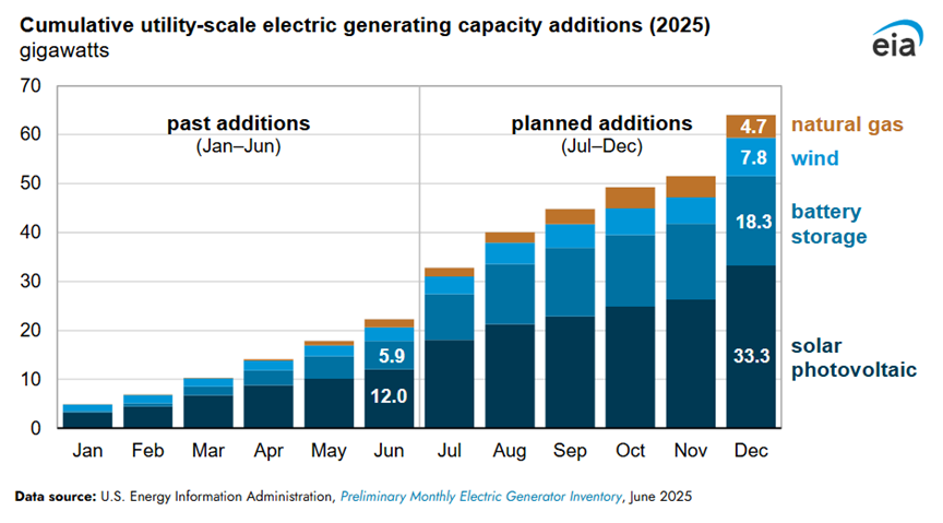 Developers added 12 gigawatts (GW) of new utility-scale solar electric generating capacity in the United States during the first half of 2025, and they plan to add another 21 GW in the second half of the year, according to our latestย survey of electric generating capacity changes. If those plans are realized, solar would account for more than half of the 64 GW that developers plan to bring online this year. Battery storage, wind, and natural gas power plants account for virtually all of the remaining capacity additions for 2025.