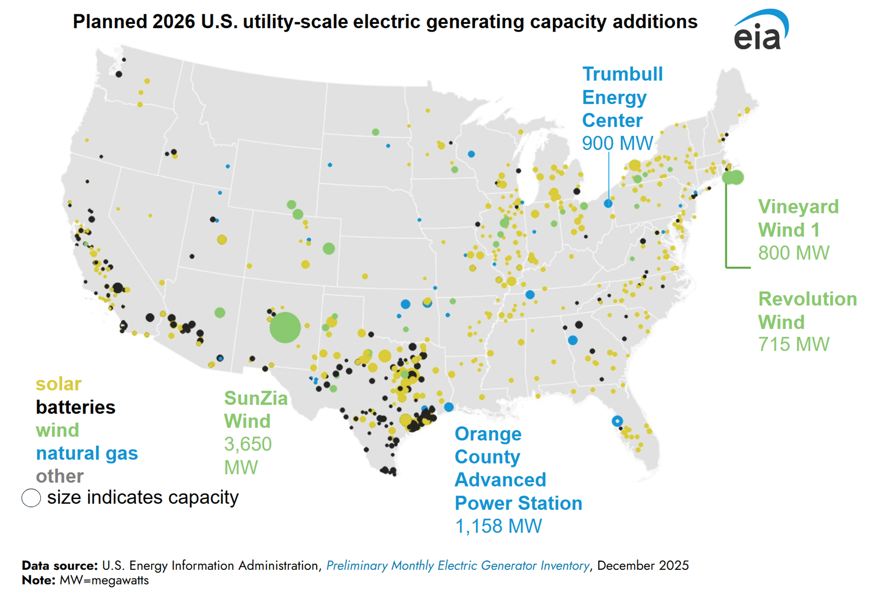 Solar. We expect 2026 to be another big year for solar additions, similar to the record utility-scale solar capacity added to the U.S. grid in 2024 (30.8 GW) and in 2025 (27.2 GW). Developers plan to add 43.4 GW of new utility-scale solar capacity in 2026, a 60% increase in capacity additions from last year if realized.