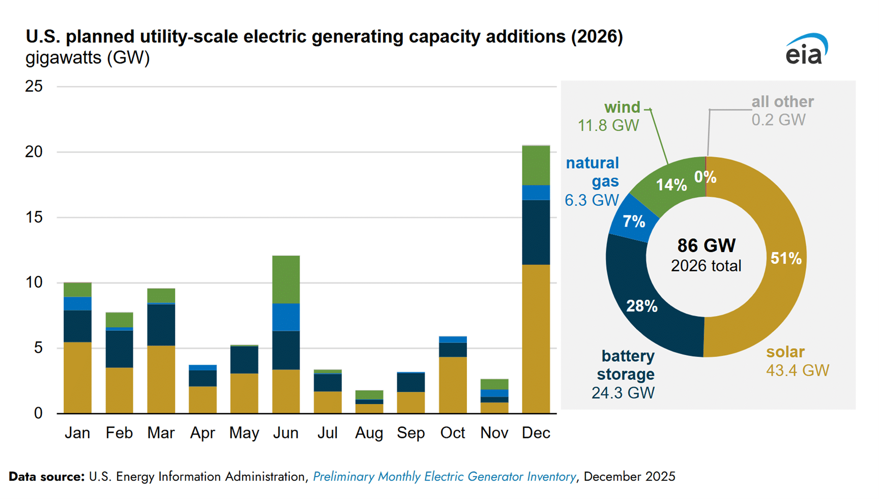 U.S. power plant developers and operators plan to add 86 gigawatts (GW) of new utility-scale electric generating capacity to the U.S. power grid in 2026 in our latest Preliminary Monthly Electric Generator Inventory report, a record if realized. Solar power makes up 51% of the planned 2026 capacity additions, followed by battery storage at 28% and wind at 14%.