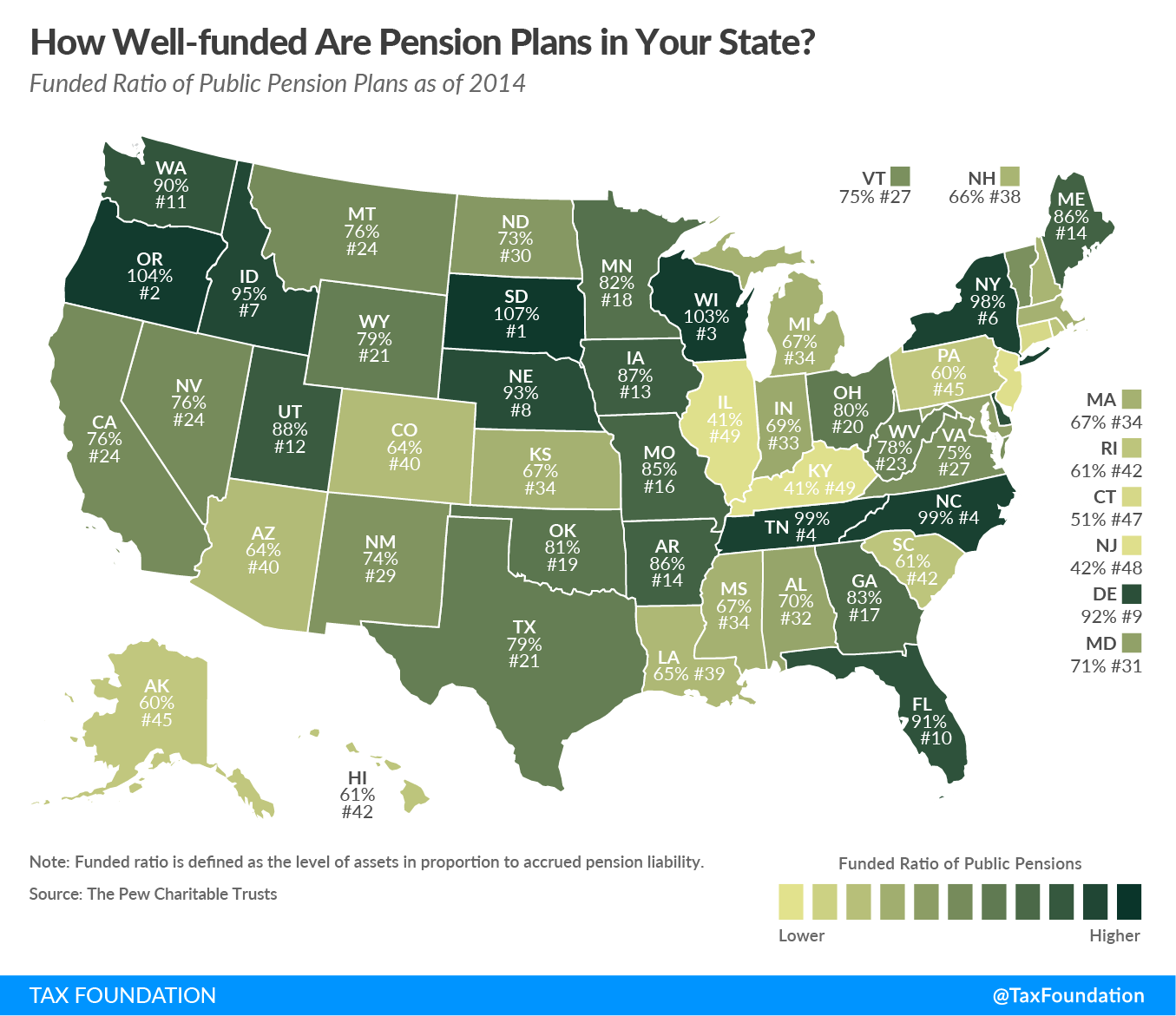 The Tax Foundation has created a map of each state’s pension funding situation. It’s not pretty. If you live in South Dakota, Oregon or Wisconsin, your state is in great shape. All three have funded their pensions over 100%. But if you rely on a state pension in Illinois or Kentucky, it could get rocky. Both states’ pensions are funded at only 41%. That’s the worst in the country.