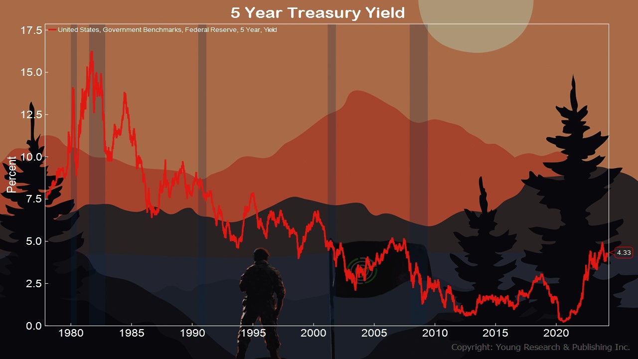 Run your finger along the 5-year treasury line in the chart above, and you immediately get a sense of where weโve been.