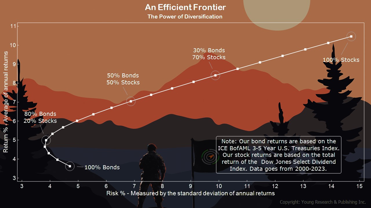 To understand risk and reward, I’ll point you to the efficient frontier. The Efficient Frontier, created by Harry Markowitz in 1952, measures the efficient diversification of investments that delivers the highest level of return at the lowest possible risk. Note that in my efficient frontier example above, I’m using a diversified, dividend-oriented stock index and a shorter-term bond index spanning 3-5 year maturities—one or two stocks are not diversified, nor are a bond or two. Also worth noting is that this comparison begins this century, one that has been manipulated by an interventionist Federal Reserve beginning with Mr. “Irrational Exuberance” Greenspan, then Mr. “Helicopter Ben” Bernanke and the others to follow.