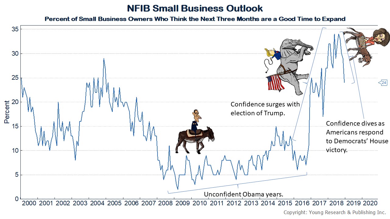 America’s small business owners are responding to the rise of Democrats to power in Congress. When it became clear that Democrats would take the House, small business confidence began to fall rapidly. After the election confirmed those fears, confidence began falling even faster.