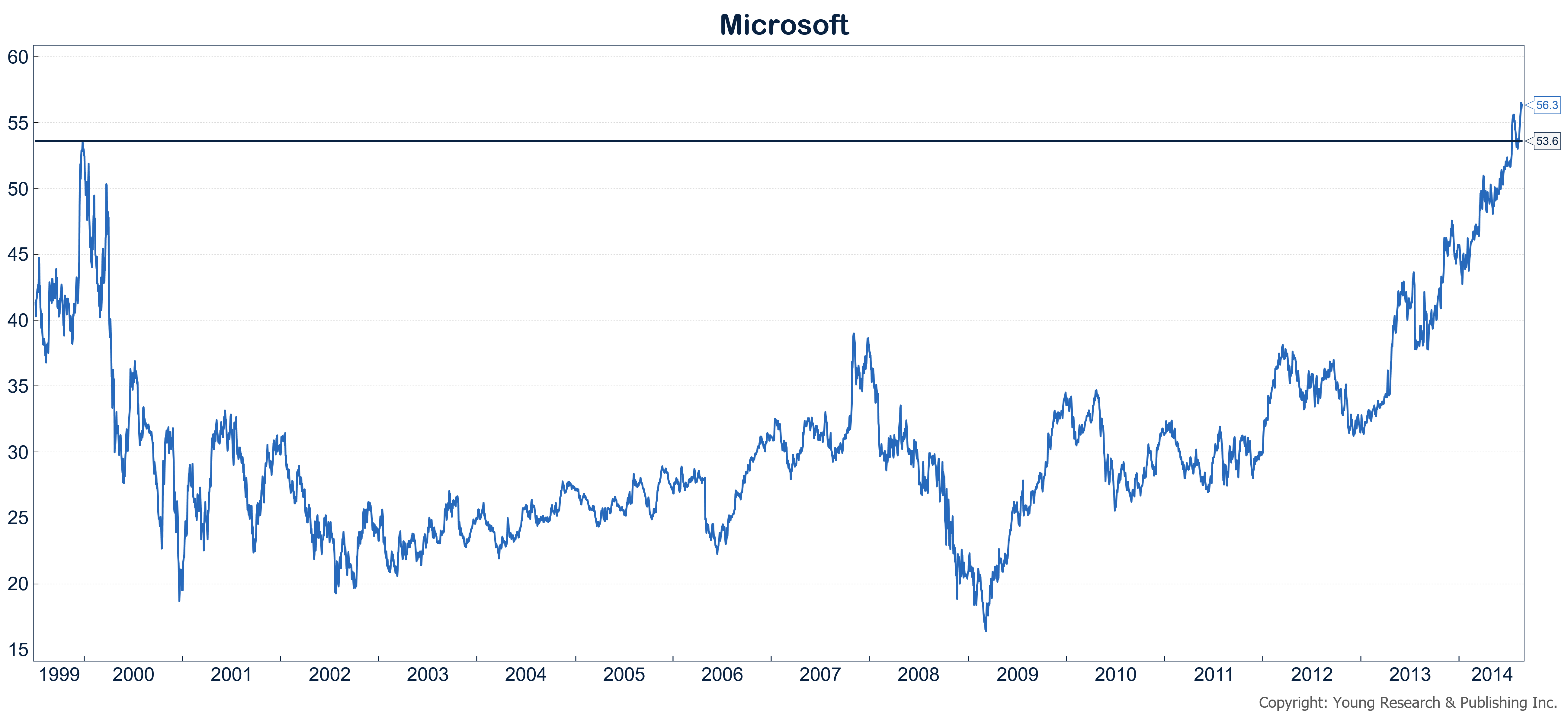 Take Microsoft for example. Microsoft hit a high of $53.61 in December of 1999 on expectations that the company would dominate the market for operating systems for the foreseeable future and its earnings would continue to increase at a rapid clip.