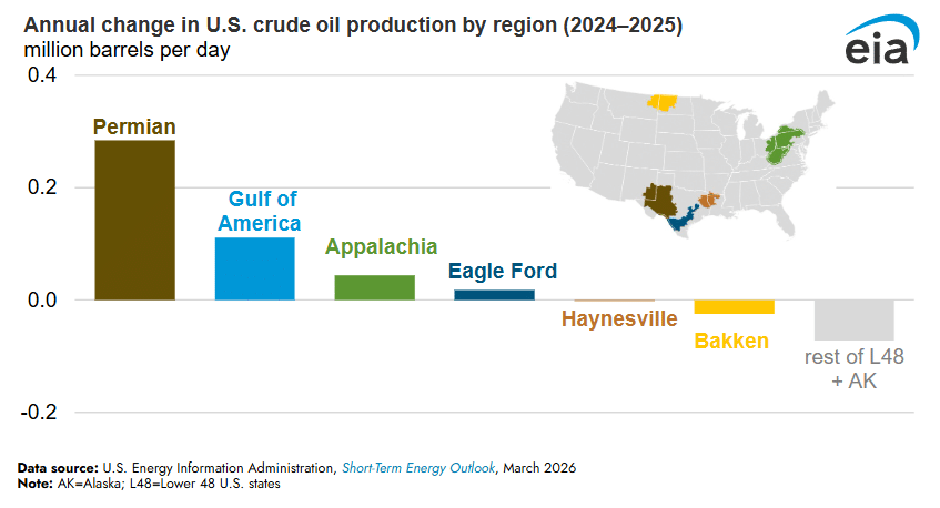 In 2025, the Permian region in western Texas and southeastern New Mexico produced more crude oil than any other region, accounting for 48% of total U.S. crude oil production. Most of the annual U.S. crude oil production growth in 2025 also came from the Permian, where production grew by 280,000 b/d to 6.6 million b/d.