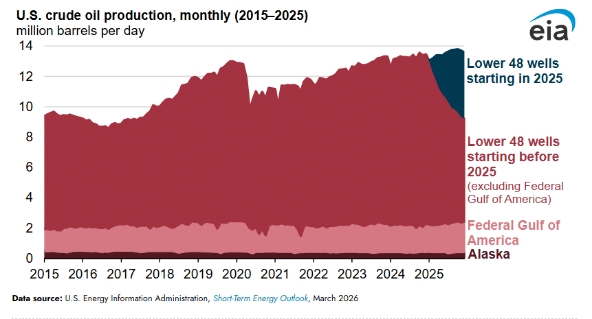 U.S. crude oil production grew by 3%, or 350,000 barrels per day (b/d), in 2025, setting a new annual production record of 13.6 million b/d, according to our latest Short-Term Energy Outlook (STEO). Production from the Lower 48 states excluding the Gulf of America (L48) accounted for 11.3 million b/d, or 83% of the total U.S. crude oil production in 2025. The rest of the production came from Federal Gulf of America (GOA) and Alaska.