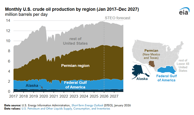 The United States set an annual production record in 2025, led by increases in the Permian region in western Texas and southeastern New Mexico and, to a lesser extent, offshore production increases in the Gulf of America. In 2025, the Permian region alone accounted for almost half of total U.S. crude oil production.