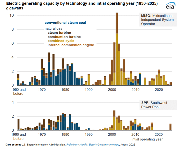 We expect natural gas to continue to gain market share in these regions as older, less efficient coal-fired generators retire. With the exception of a few coal-fired generators that came online in the late 2000s and early 2010s, nearly all of the coal-fired capacity in these two regions came online before 1990. By comparison, much of the natural gas capacity in SPP and MISO is from the newer and relatively efficient combined-cycle units that have come online since 2000.