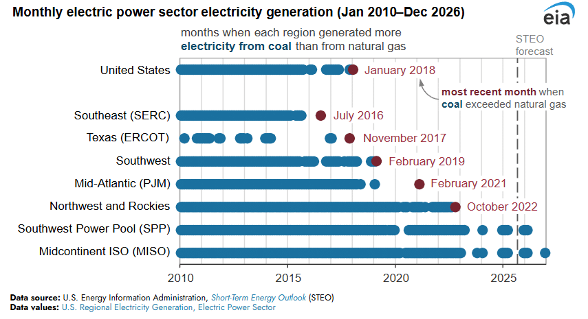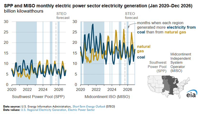 As recently as 2021 and 2022, both SPP and MISO were producing more electricity from coal than from natural gas in every month of the year. More recently, coal has exceeded natural gas only in the winter months, when demand for space heating and related demand for electricity increase. In MISO and SPP, we expect coal generation to exceed natural gas generation from December 2025 through February 2026.